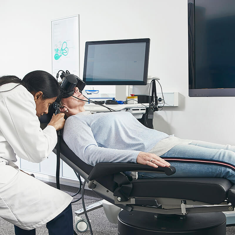 Orion Reclining är en kompakt roterande stol utan inneslutning. Genom att använda VNG-glasögon för att få en ljustät förslutning i stället för en inneslutning, kan du fälla stolen för att utföra hela VNG-testbatteriet.